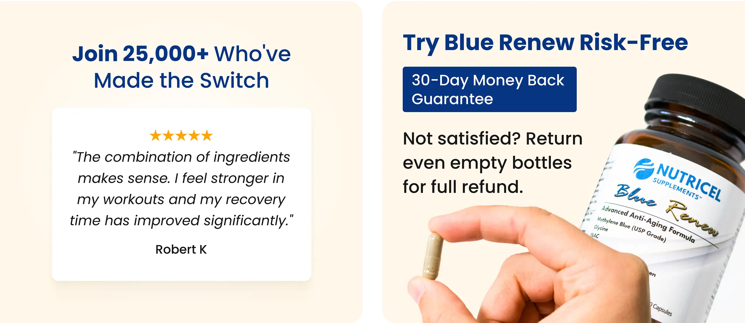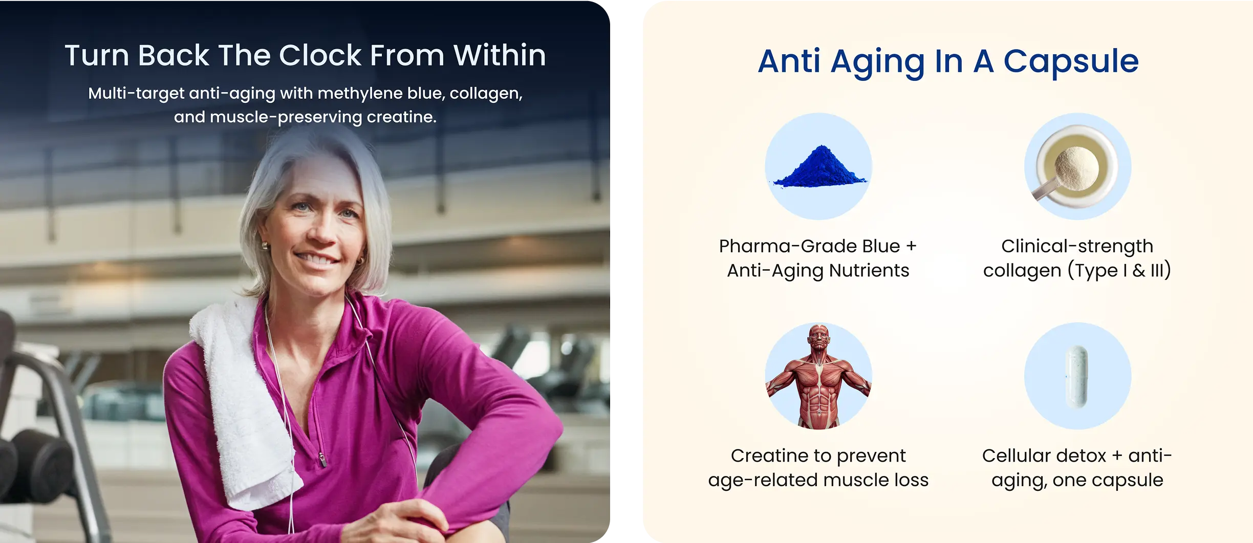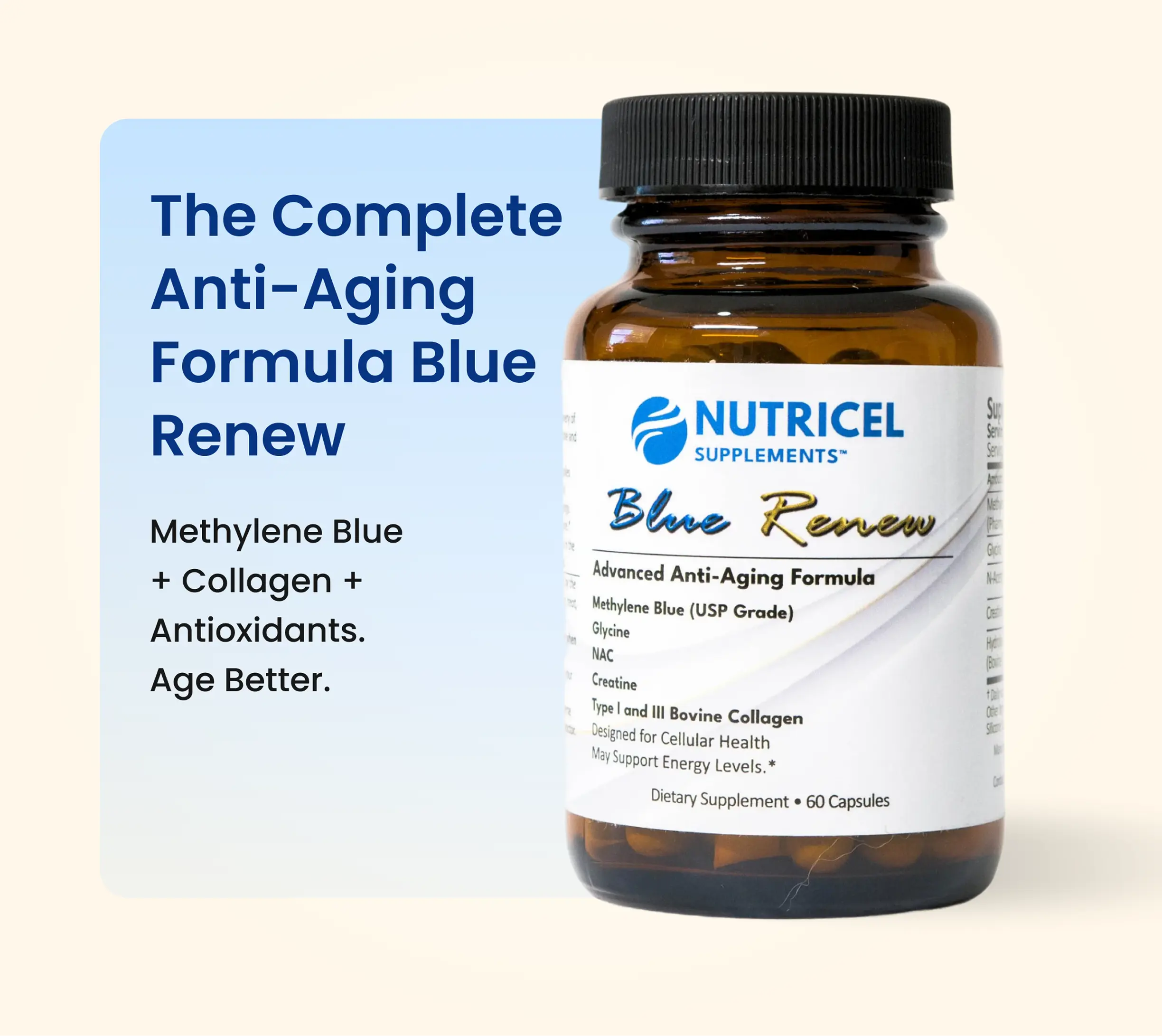 Blue Renew is a premium anti-aging supplement anchored by USP-grade pharmaceutical-level methylene blue and a thoughtfully selected blend of supporting nutrients designed to help support cellular regeneration, stress resilience, and graceful aging at the cellular level.