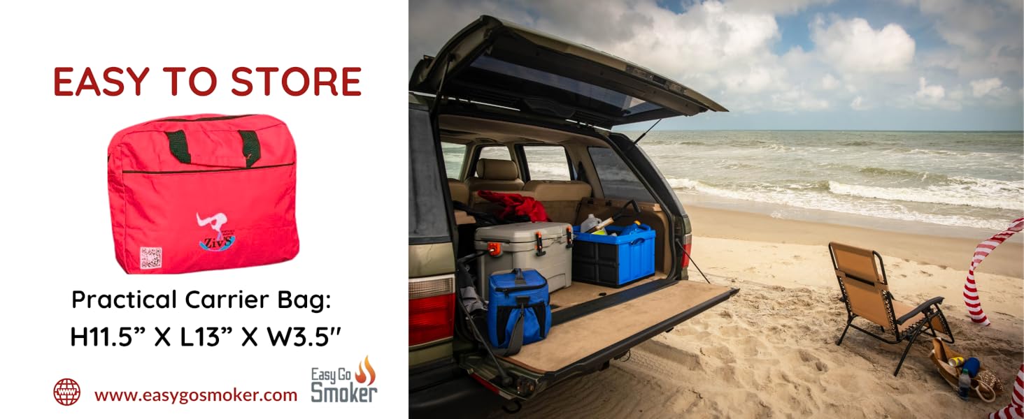 PROFESSIONAL PORTABLE SMOKER: The EasyGoSmoker comes with a compact carrying bag that allows you to take the smoker anywhere. Whether you're camping, fishing, embarking on an outdoor RV adventure, tailgating, or hiking, our easy-to-carry meat smoker will always be a handy addition to your BBQ gear. Use on camping stove, grill or fire.