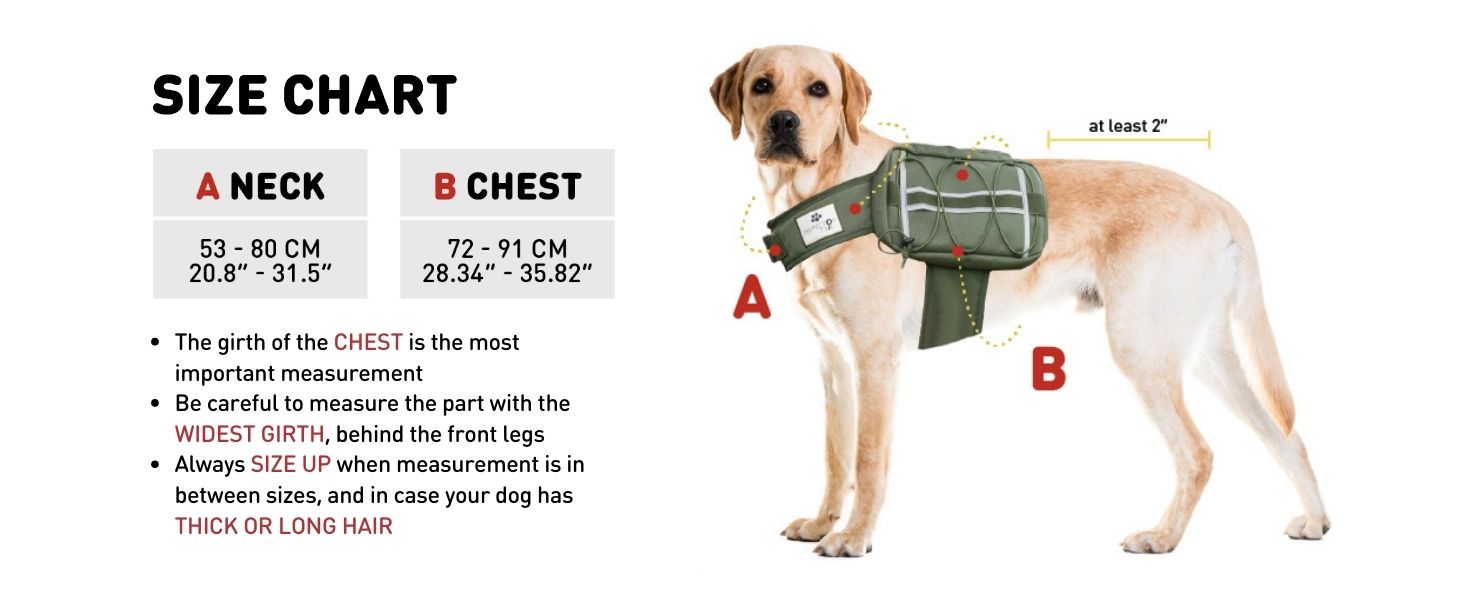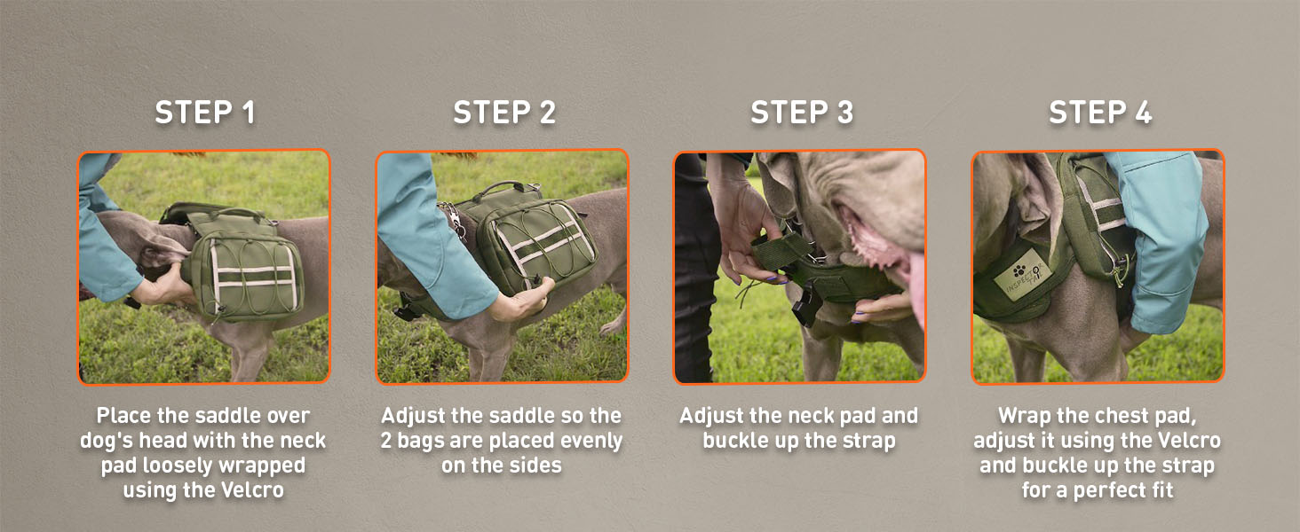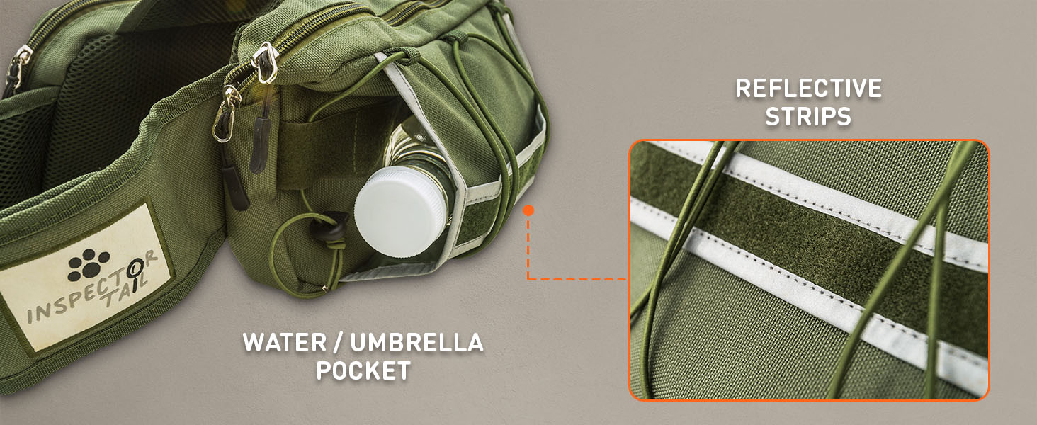 This backpack harness holds essentials like a travel bowl, water bottle, treats, and waste bags. Distribute weight evenly across the dog’s back!