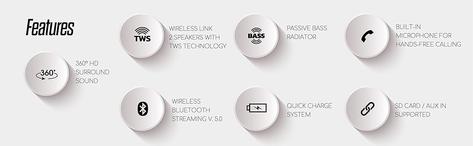 • Versatile Playback Options: Enjoy music via BT, AUX IN, TF, or Micro SD input.